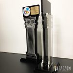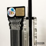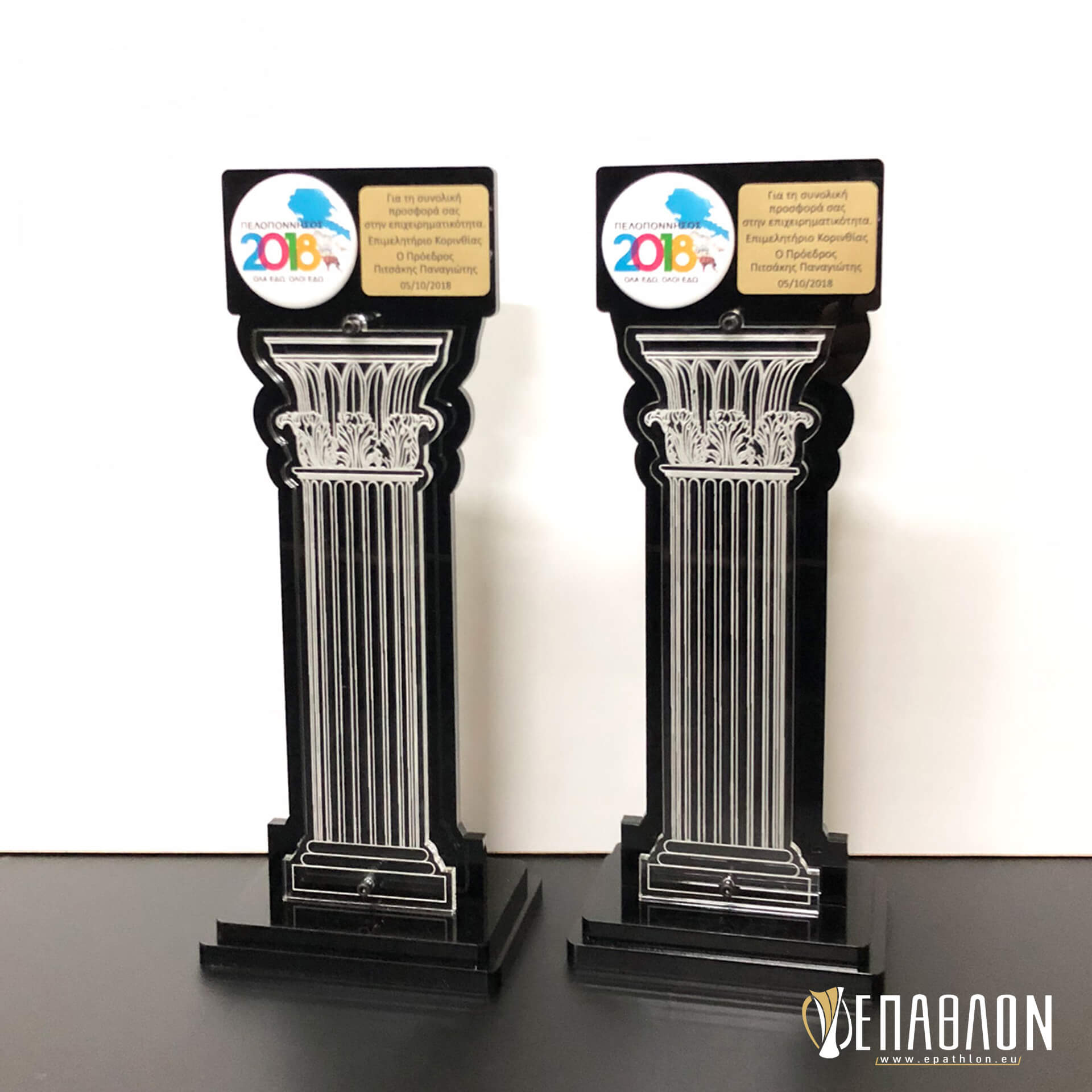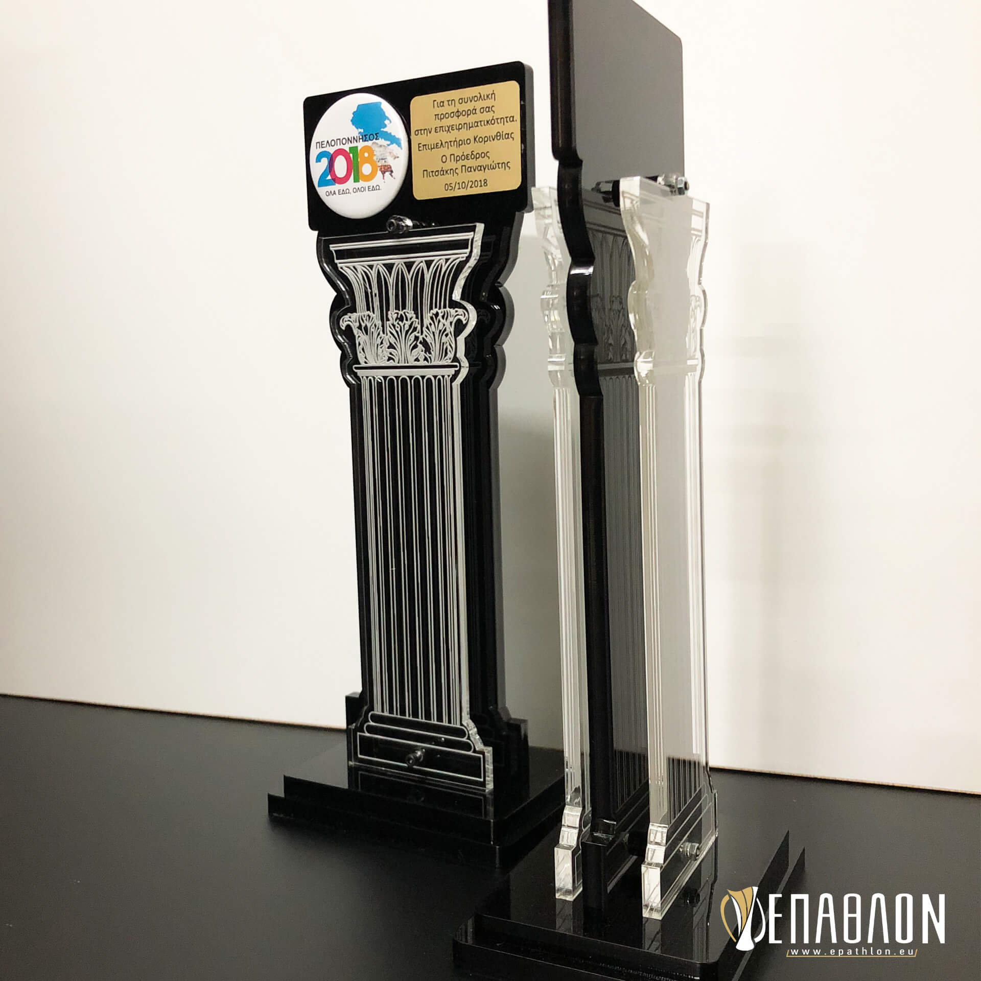 • Υλικά: Ακρυλικό μαύρο πάχους 8mm, ακρυλικό διάφανο πάχους 6mm με χάραξη σε μπροστά και πίσω όψη, ταμπελάκι από χρυσό darwin με χάραξη και το λογότυπο σε κονκάρδα. Βάσεις από μαύρο ακρυλικο
