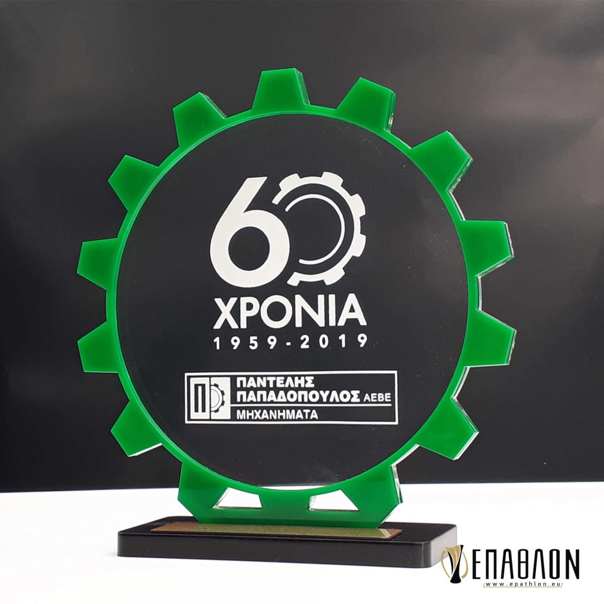 • Υλικά: Ακρυλικό διάφανο πάχους 8mm με χάραξη, πράσινο ακρυλικό πάχους 3mm, βάση από μαύρο ακρυλικό