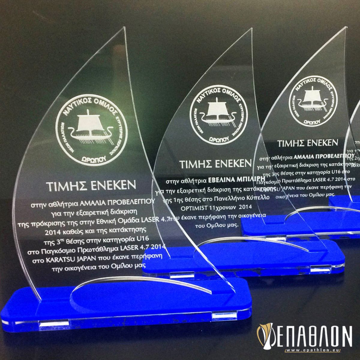 Custom έπαθλο για το ΝΑΥΤΙΚΟ ΟΜΙΛΟ ΩΡΩΠΟΥ • Υλικά: Διάφανο ακρυλικό πάχους 6mm με χάραξη και βάσεις από διάφανο και μπλε ακρυλικό
