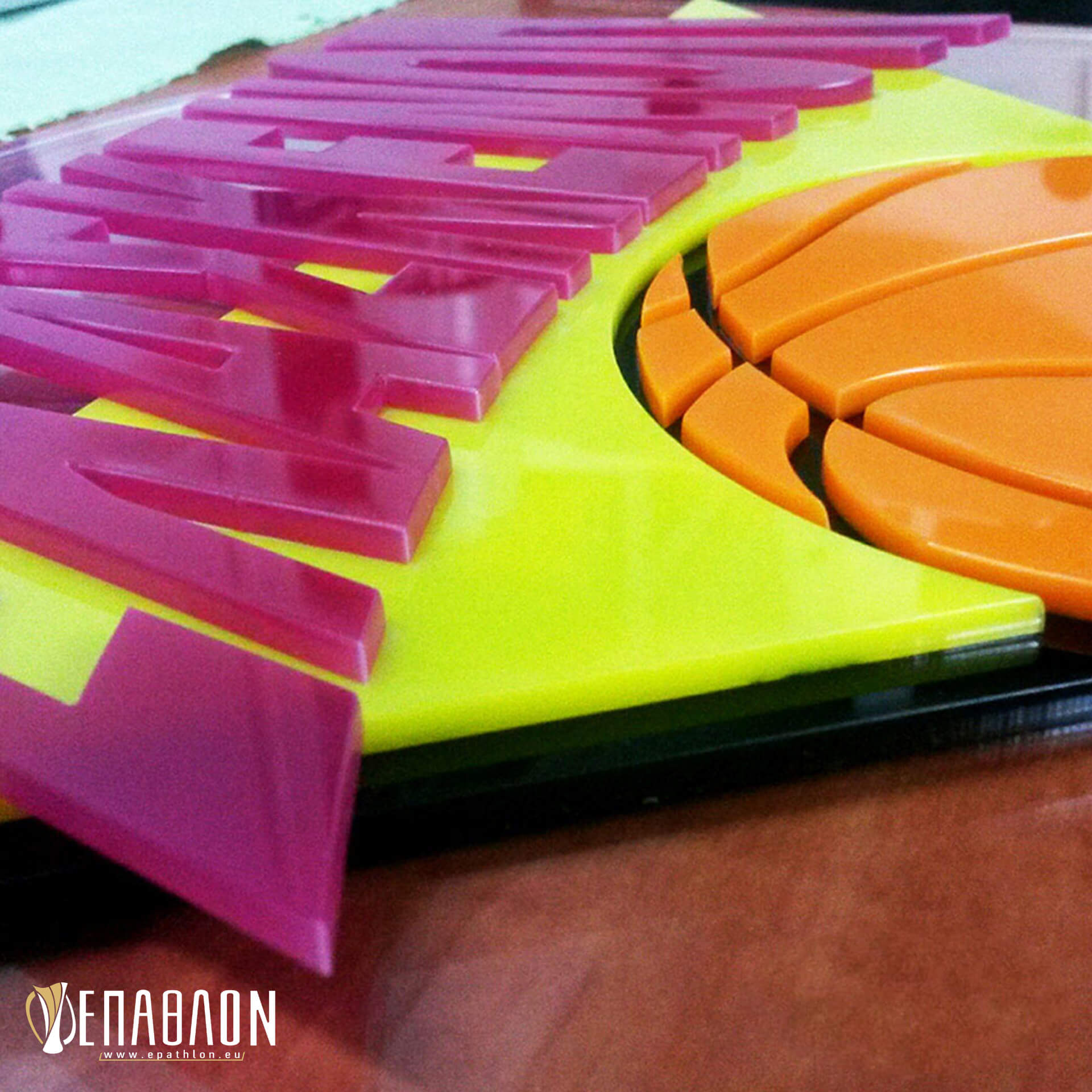 • Υλικά: Διάφανο ακρυλικό πάχους 8mm, μαύρο,κίτρινο,πορτοκαλί,φούξια ακρυλικό πάχους 3mm Βάση από μαύρο ακρυλικό