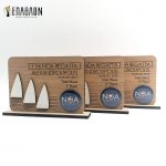 • Υλικά: Ξύλο πάχους 7mm με χάραξη, λευκό ξύλο πάχους 3mm και κονκάρδα με το λογότυπο της NOA REGATTA
