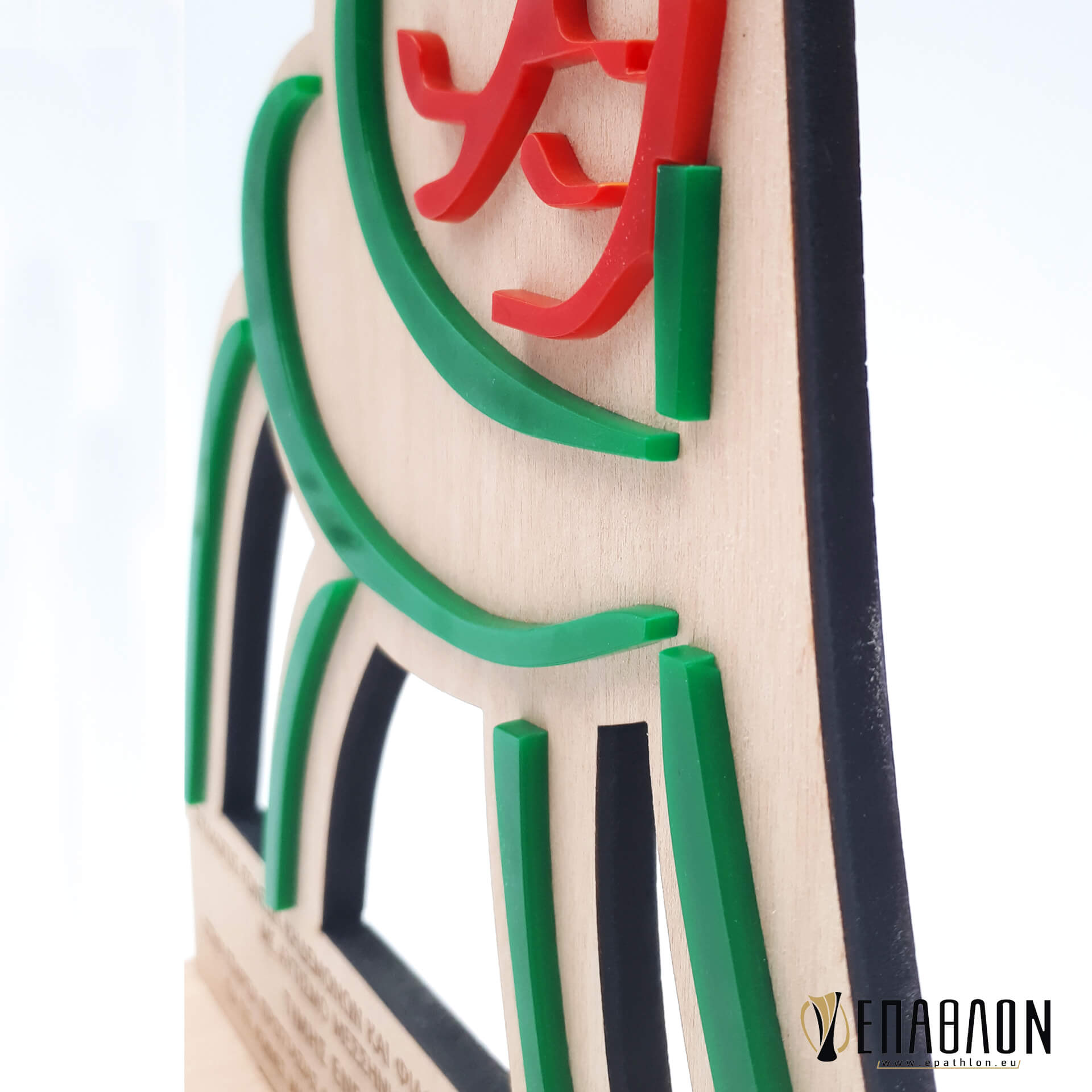 • Υλικά: Ξύλο πάχους 7mm με χάραξη, πράσινο και κόκκινο ακρυλικό πάχους 3mm για το σχηματισμό του λογοτύπου, βάση από ξύλο