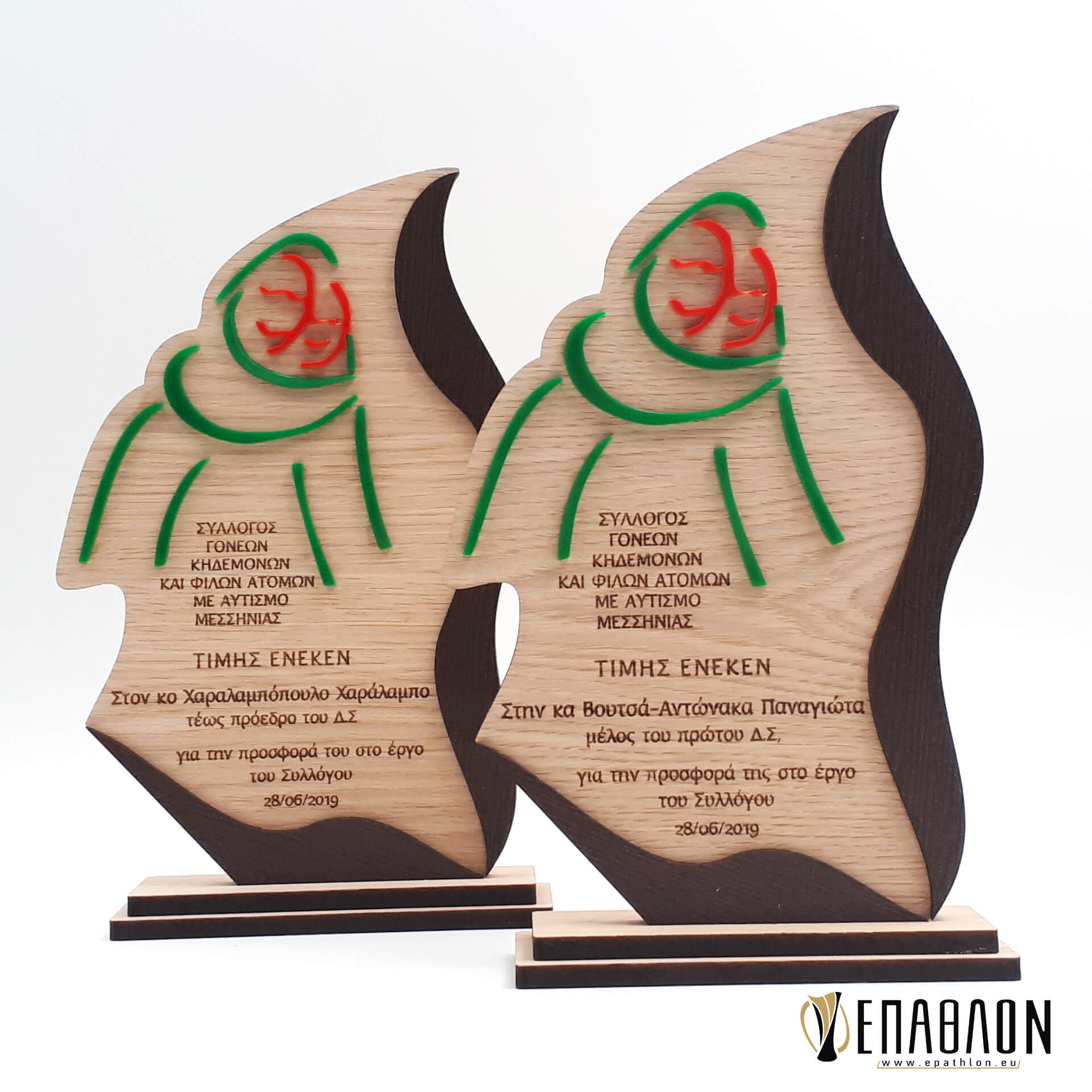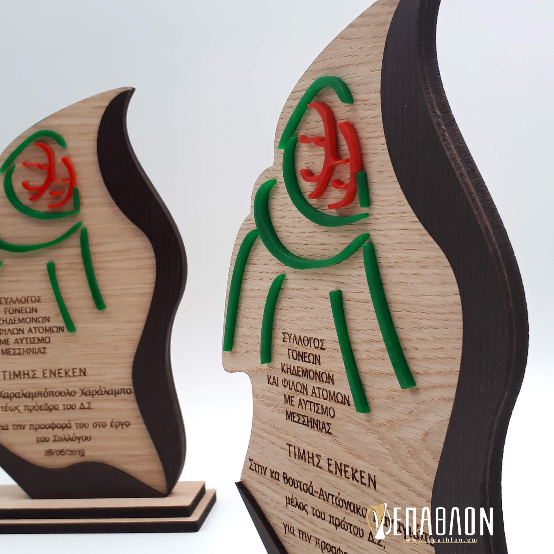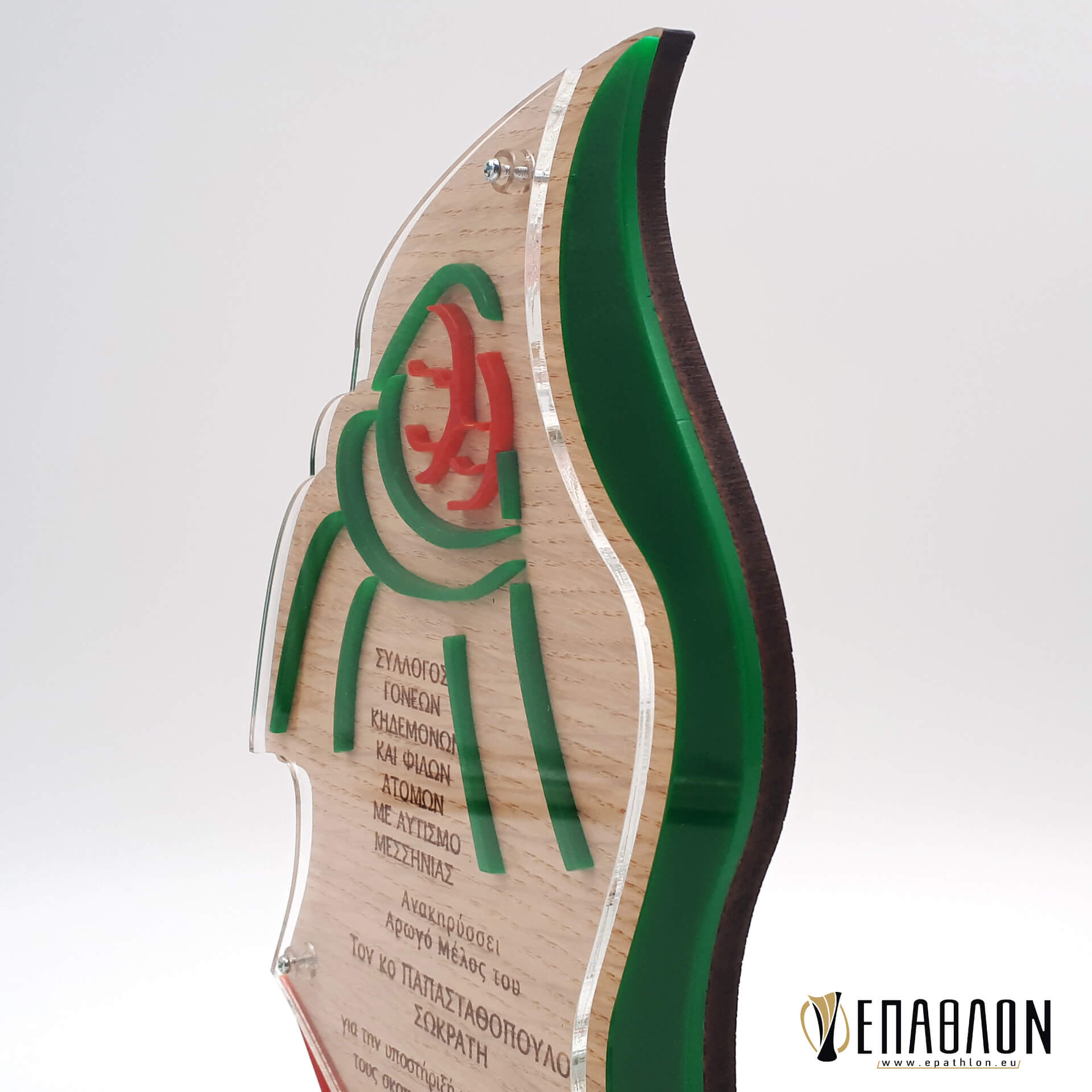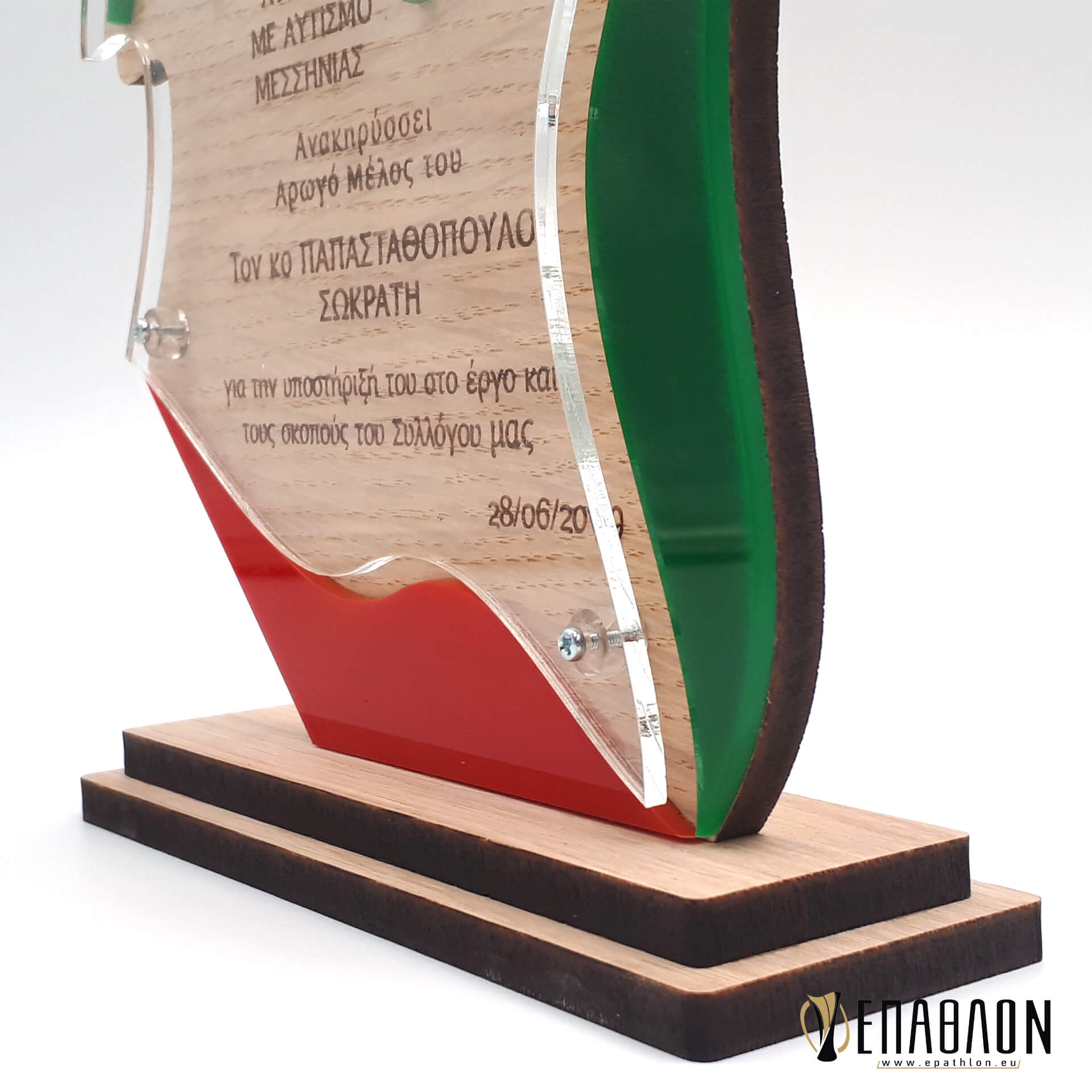• Υλικά: Ξύλο πάχους 7mm με χάραξη, πράσινο και κόκκινο ακρυλικό πάχους 3mm για διακοσμητικά στοιχεία και σχηματισμού του λογοτύπου, ακρυλικο διάφανο πάχους 3mm, βάσεις από ξύλο