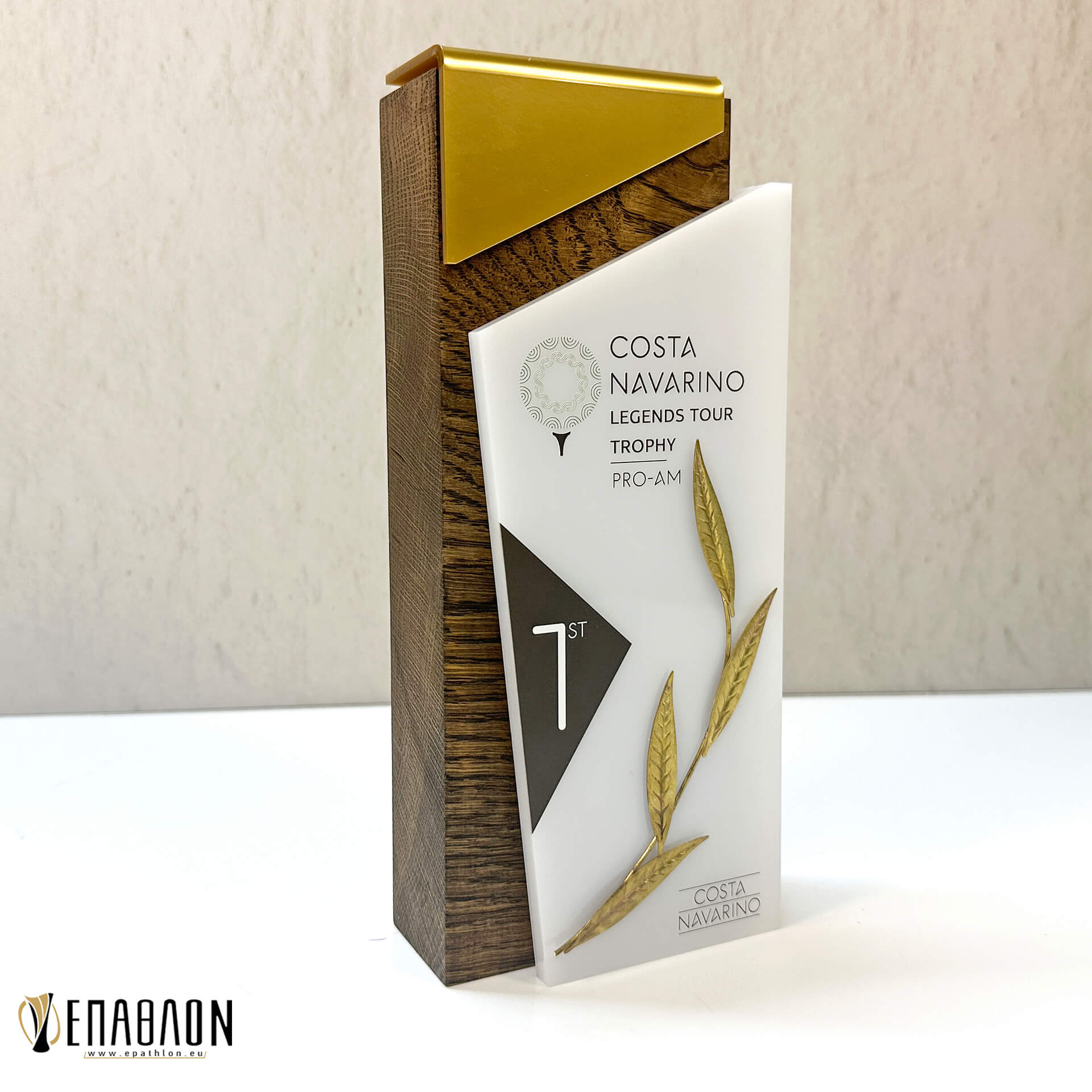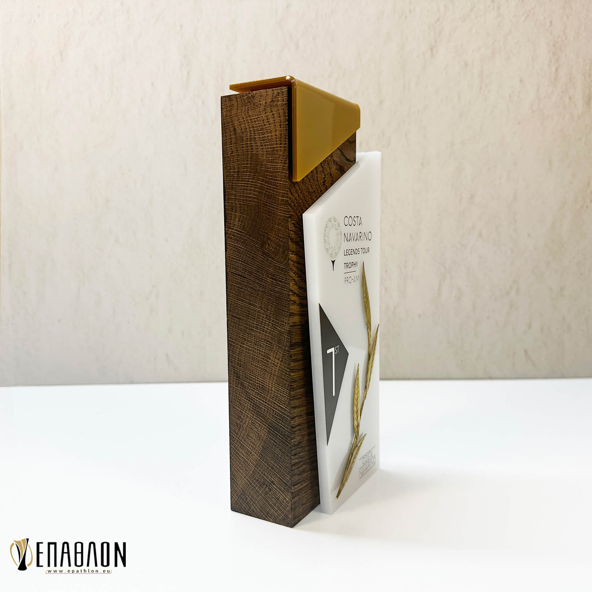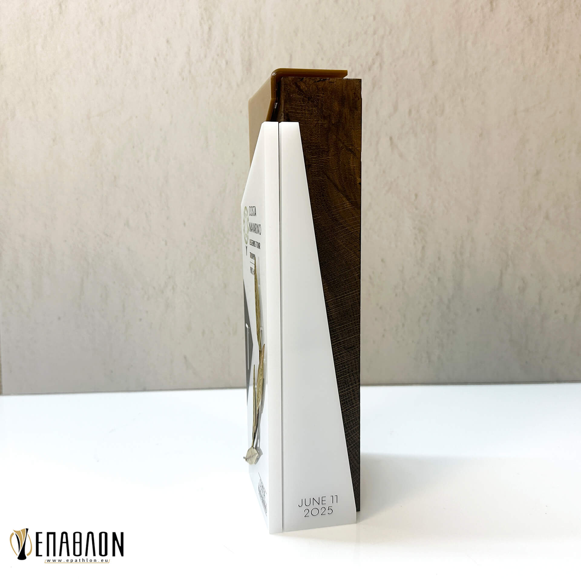 Υλικά: Μασίφ ξύλο δρυς πάχους 5mm με επίστρωση βερνίκι (απόχρωση καρυδιά) Γαλακτερό plexiglass πάχους 8mm, χειροποίητο κλαδί ελιάς, καθρέπτης plexiglass (χρυσό-ασημί-bronze) UV ψηφιακή εκτύπωση επάνω στα υλικά.