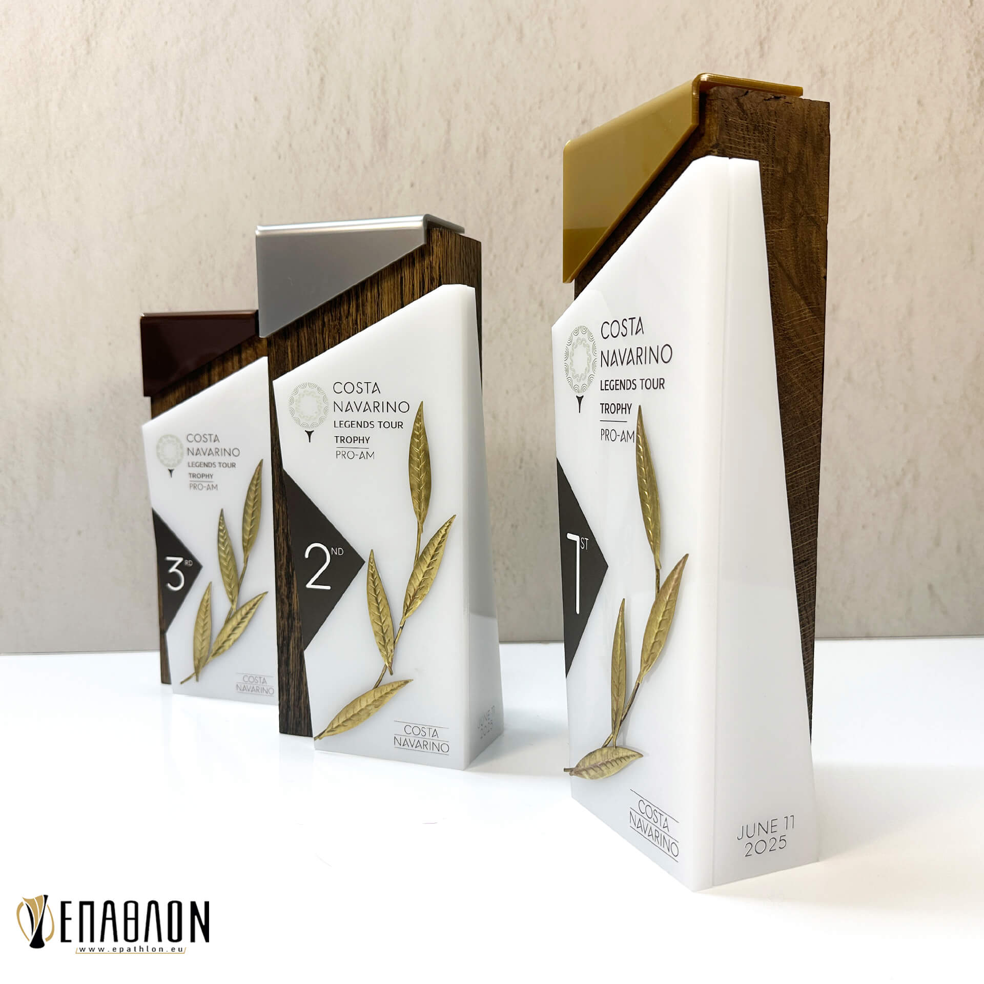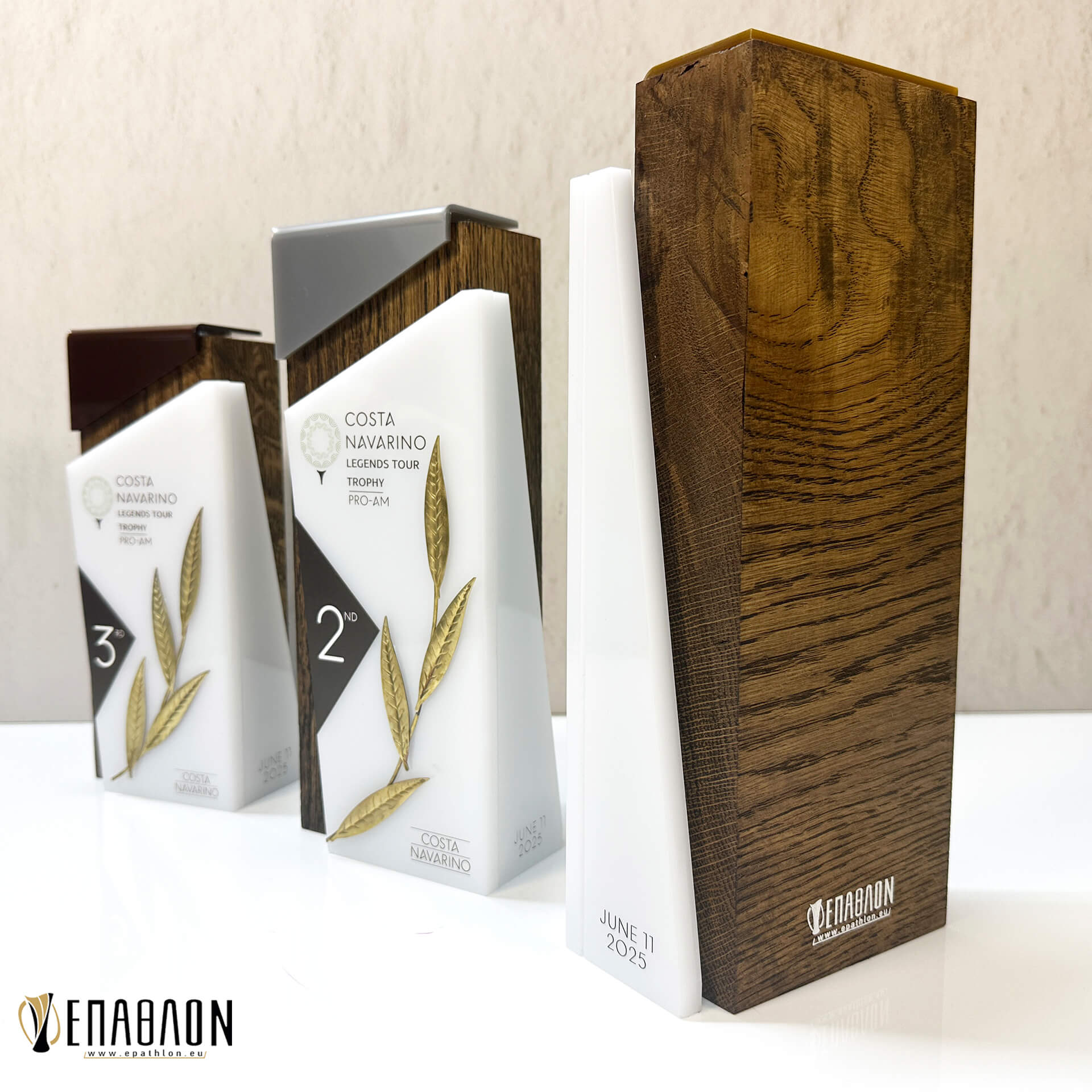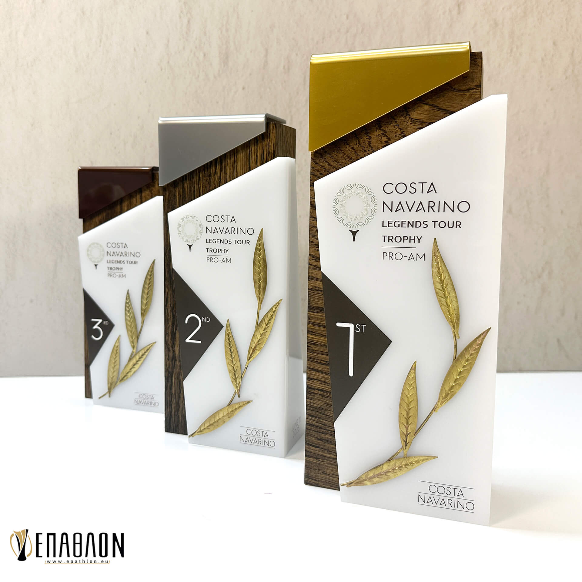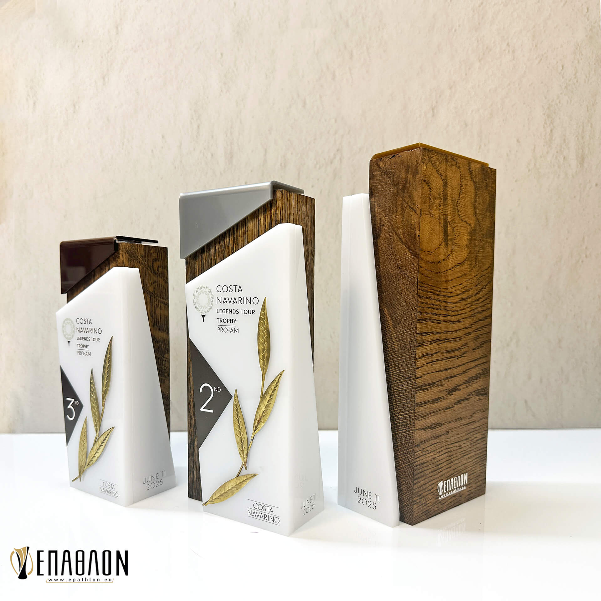 Υλικά: Μασίφ ξύλο δρυς πάχους 5mm με επίστρωση βερνίκι (απόχρωση καρυδιά) Γαλακτερό plexiglass πάχους 8mm, χειροποίητο κλαδί ελιάς, καθρέπτης plexiglass (χρυσό-ασημί-bronze) UV ψηφιακή εκτύπωση επάνω στα υλικά.
