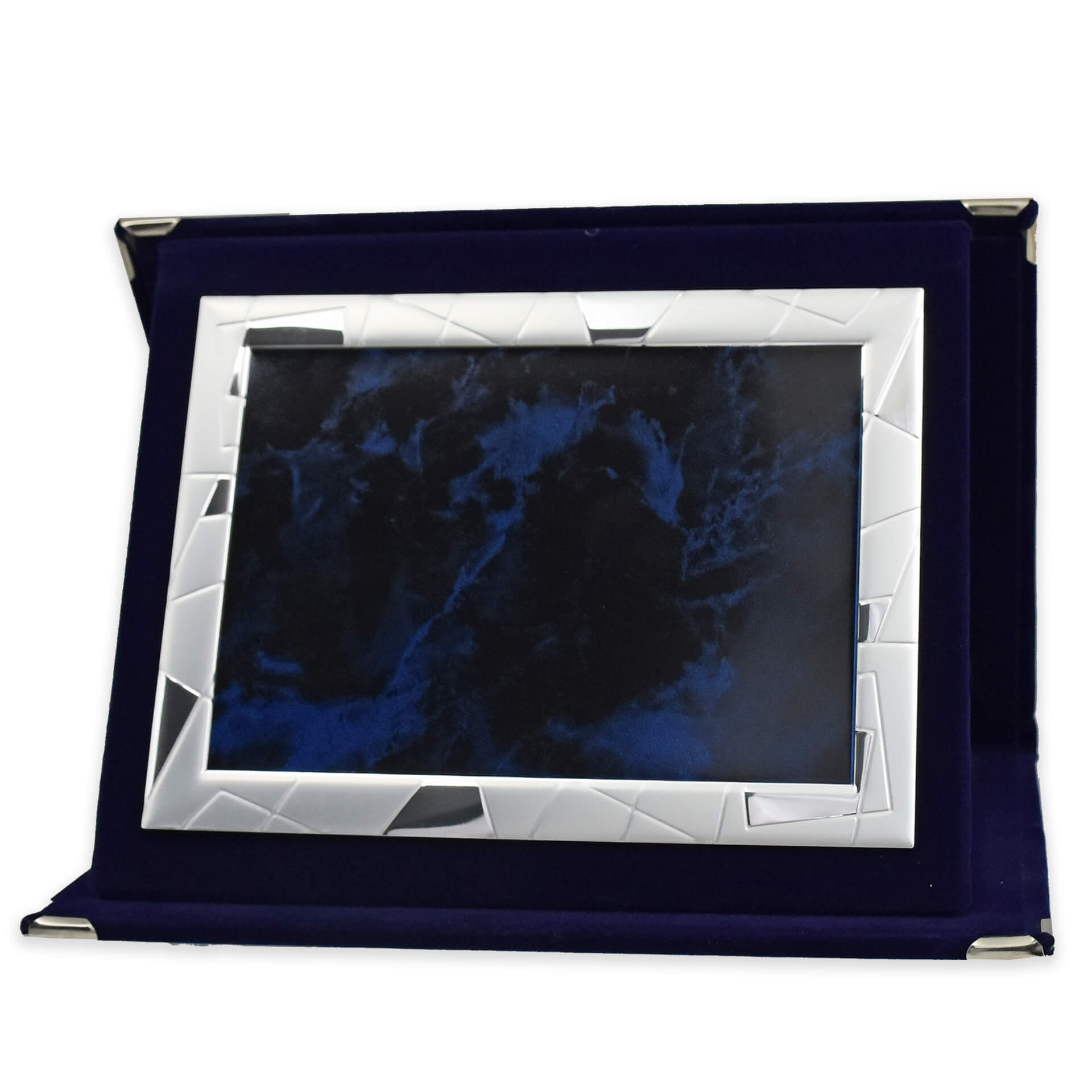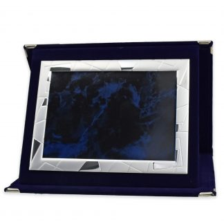 Τιμητική πλακέτα με βελούδινη κασετίνα μπλε χρώματος με μεταλλικές λεπτομέρειες και μπλε αλουμίνιο