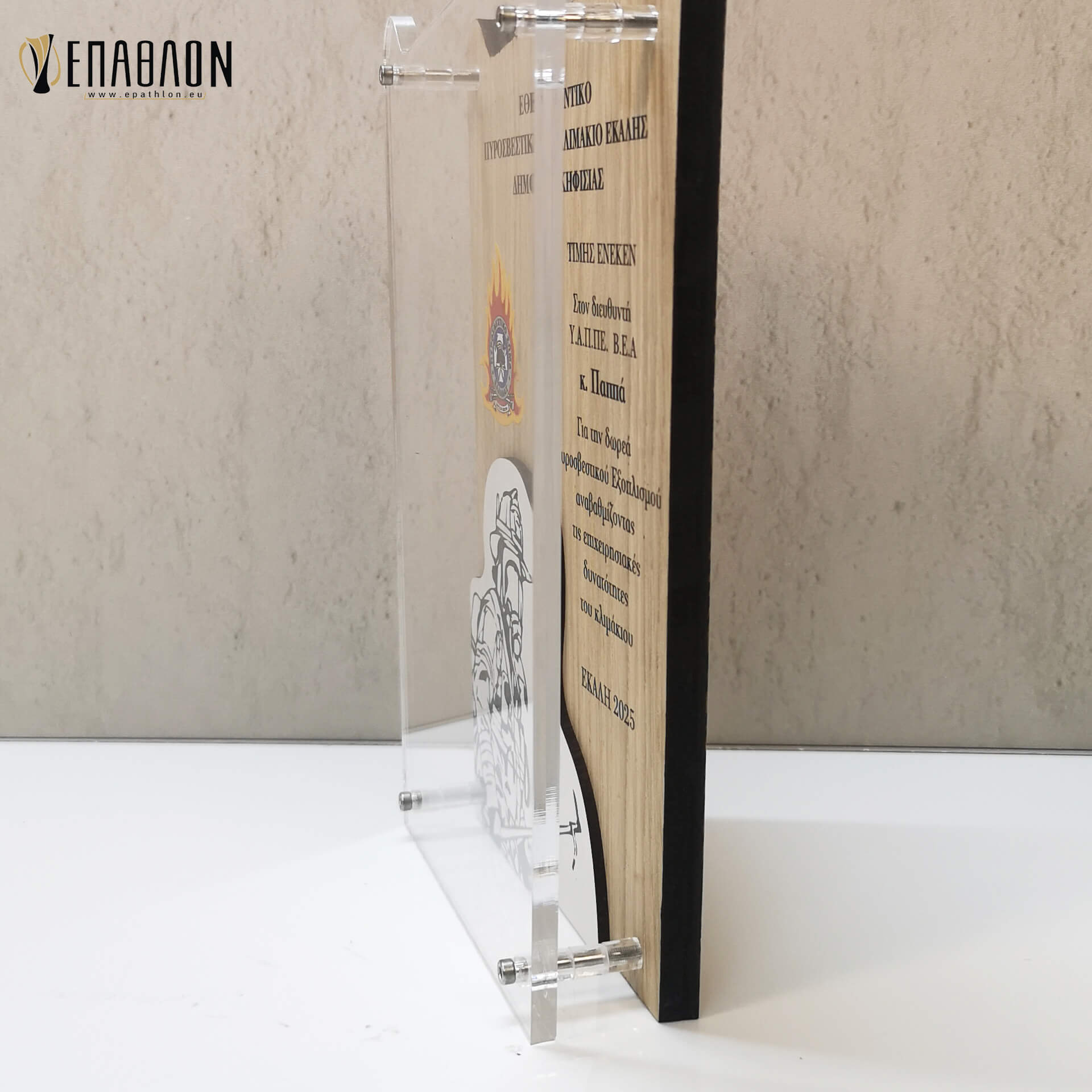 Αναμνηστική πλακέτα από συνδυασμό ξύλων και plexiglass με εκτύπωση επάνω στα υλικά