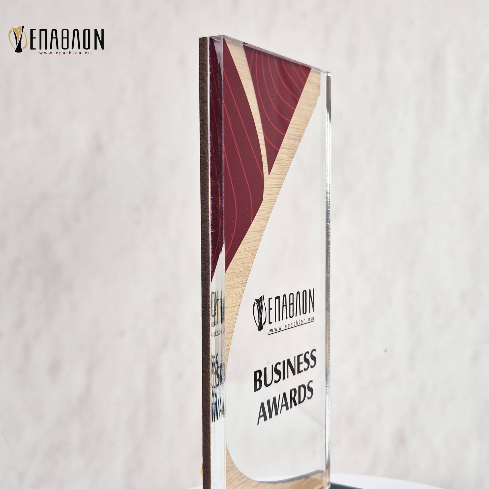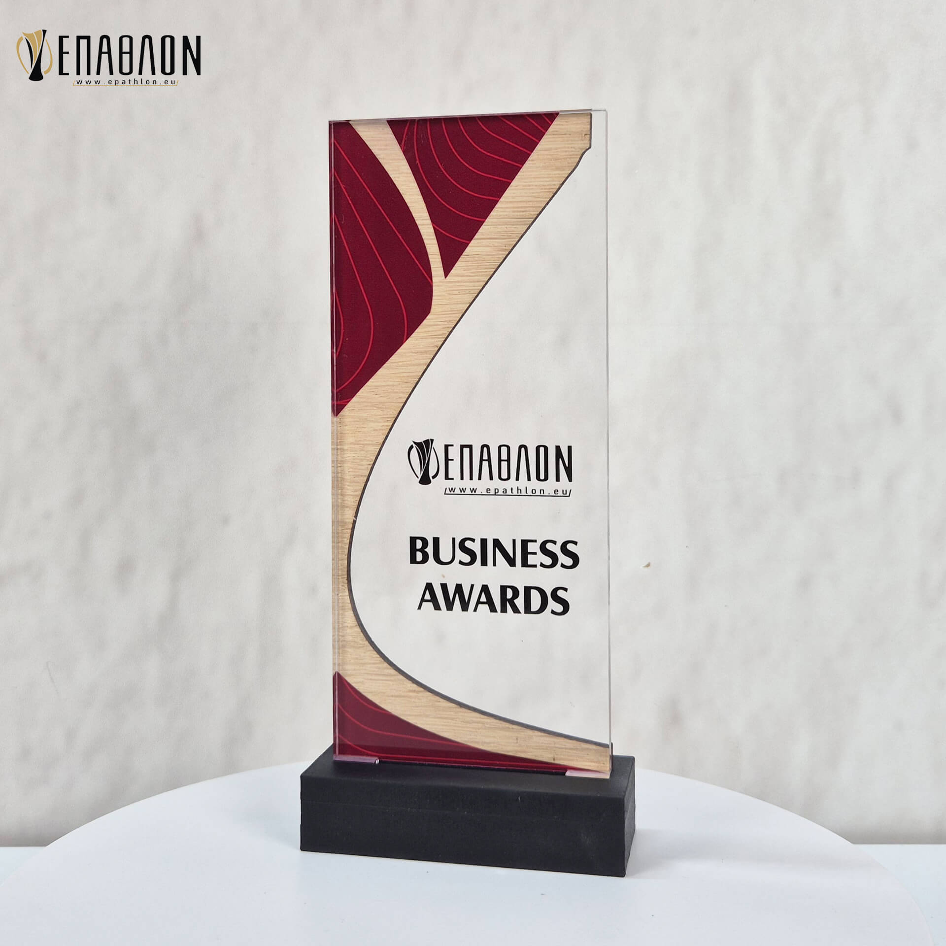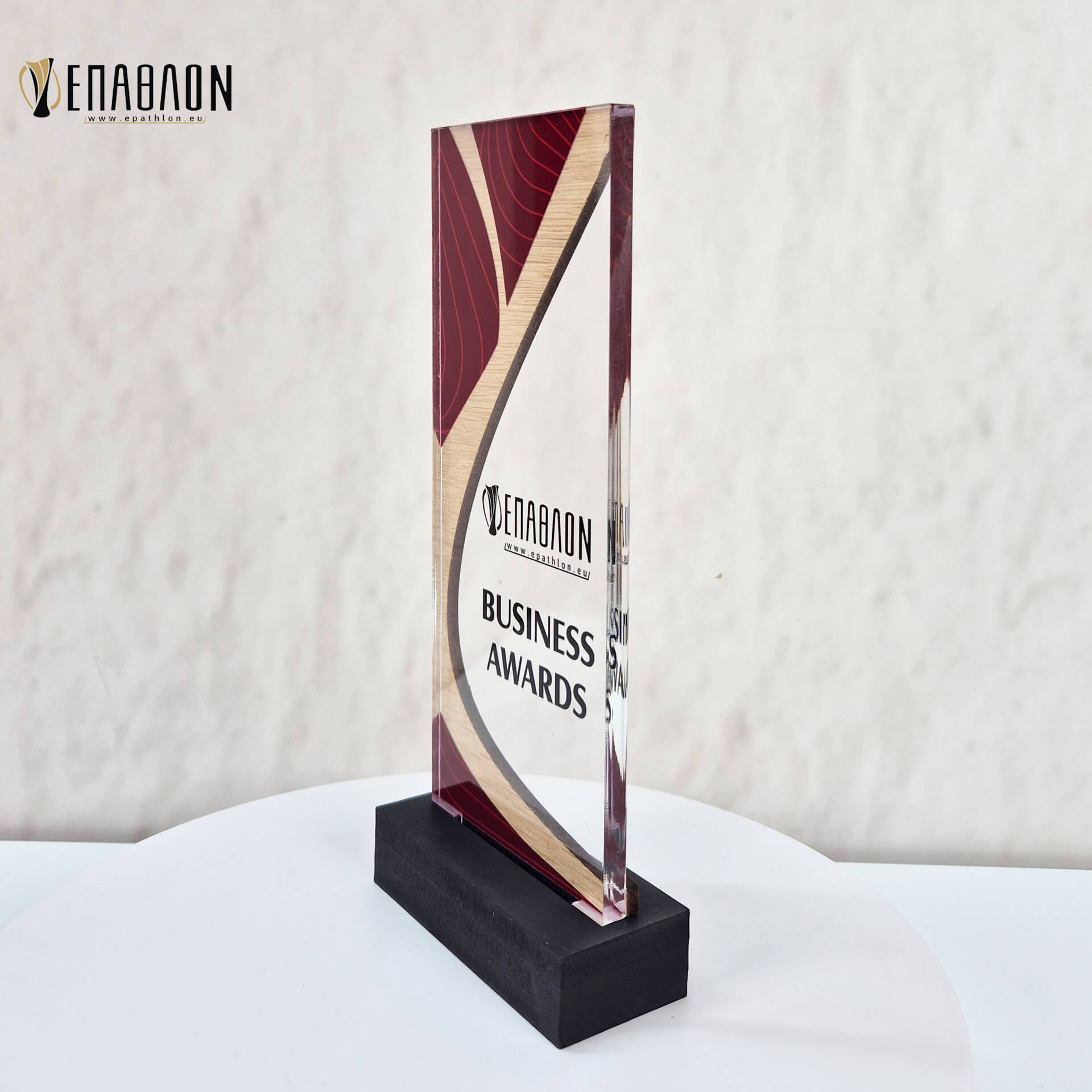 Επιχειρηματικό Βραβείο από plexiglass & ξύλο με έγχρωμη εκτύπωση επάνω στο υλικό