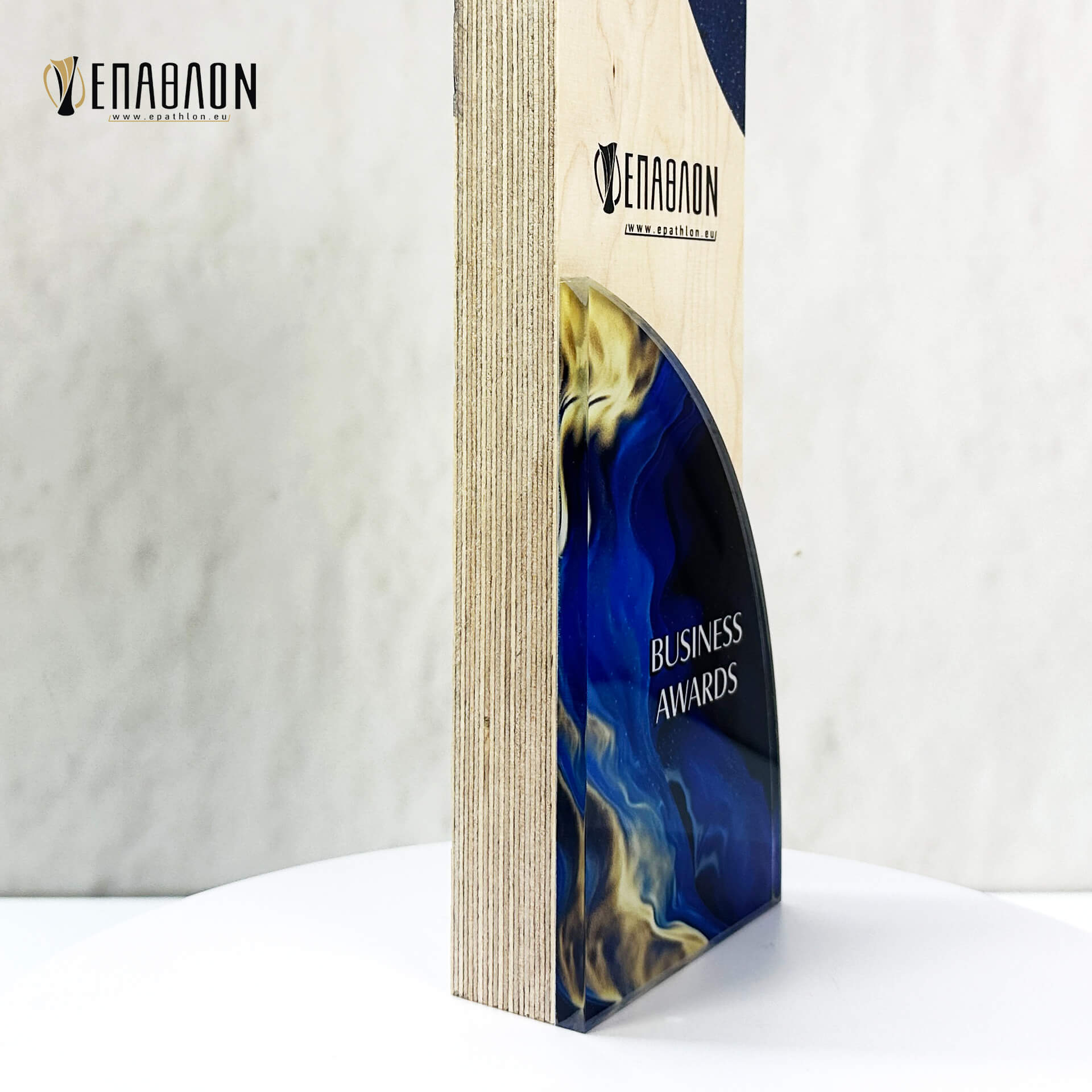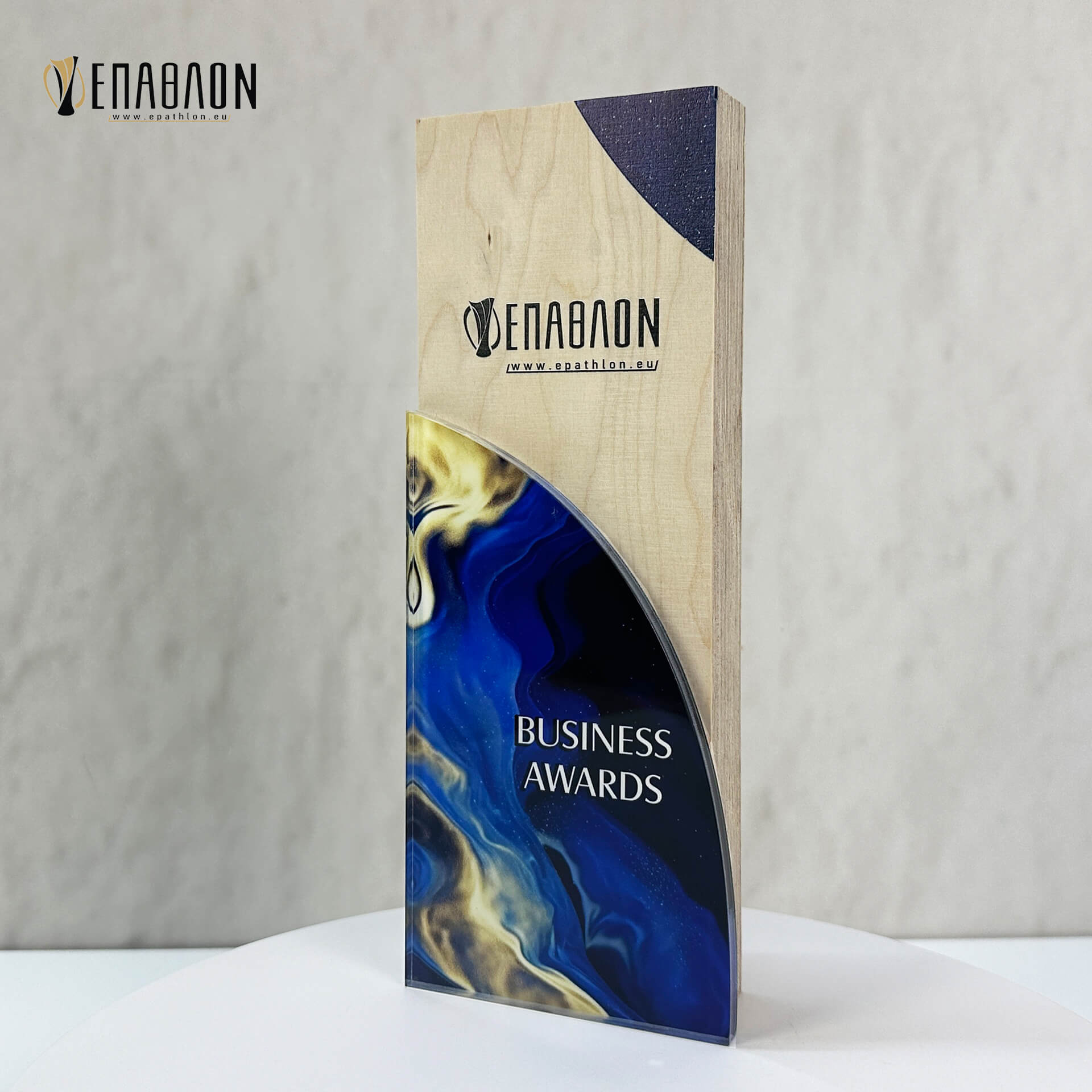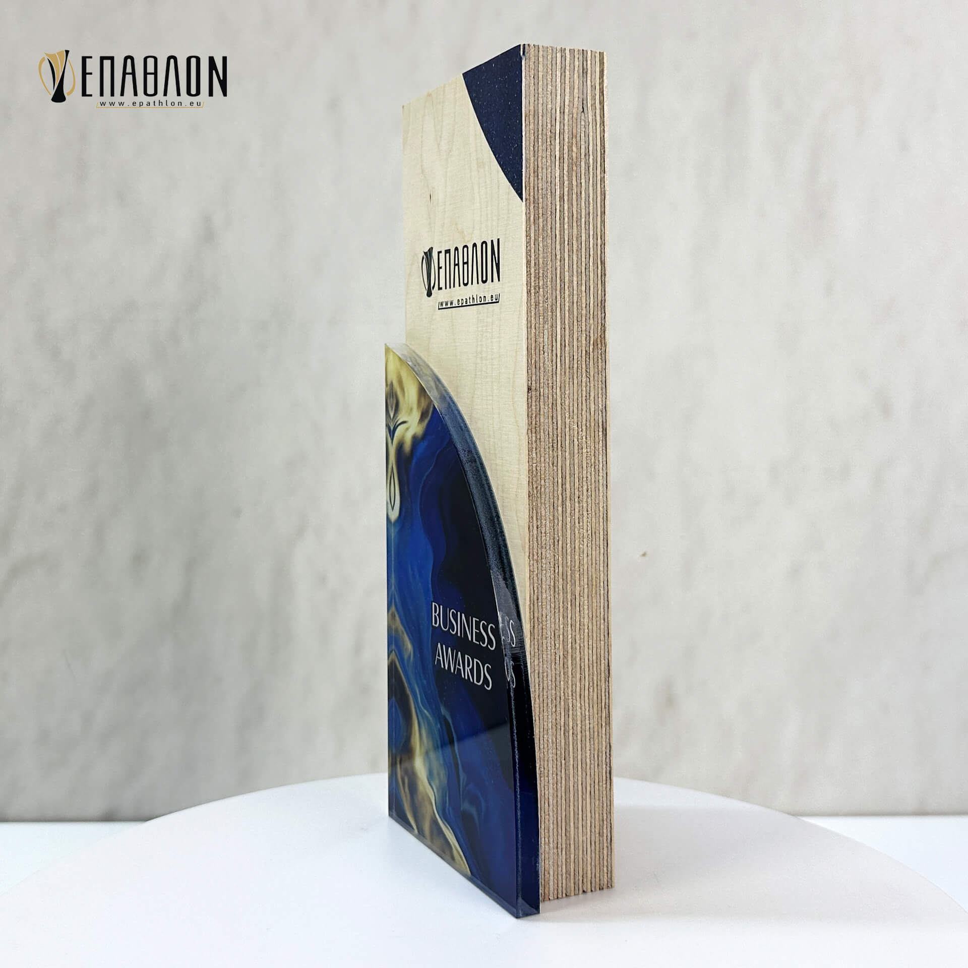 Επιχειρηματικό Βραβείο από ξύλο και plexiglass με έγχρωμη εκτύπωση επάνω στα υλικά