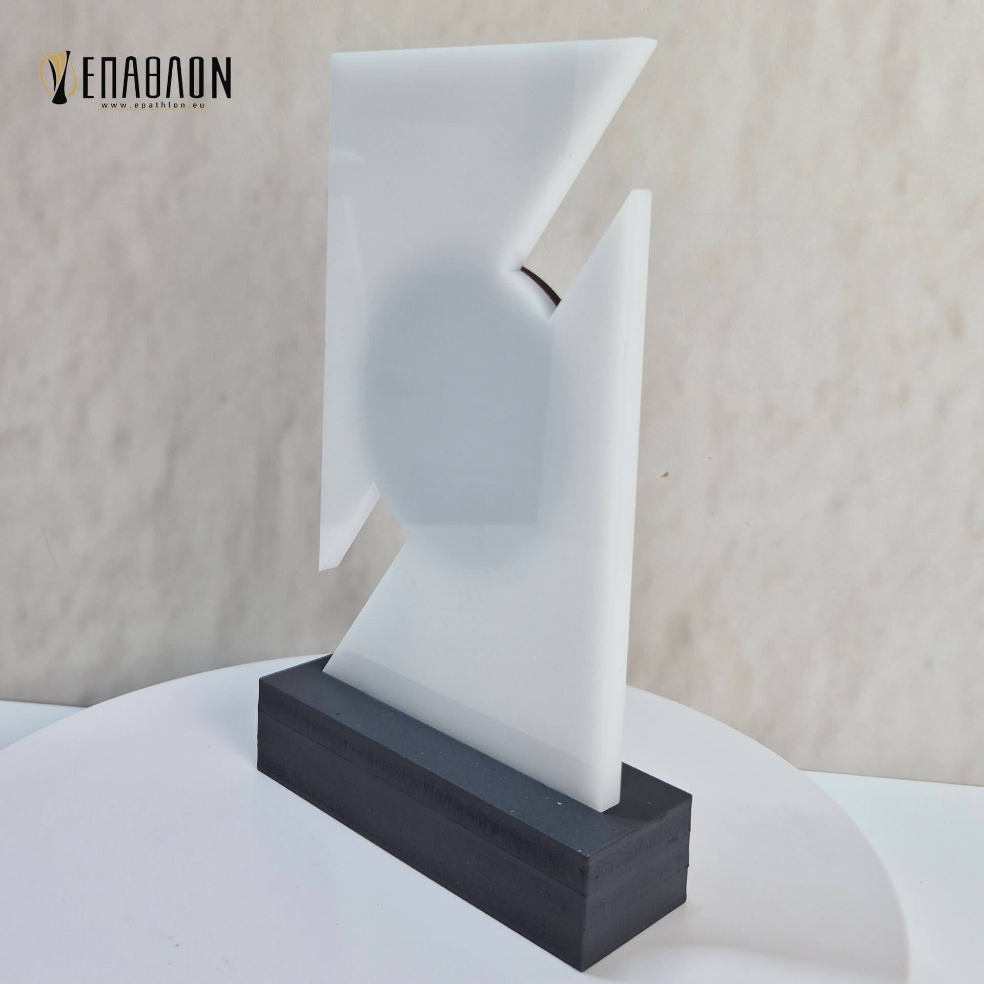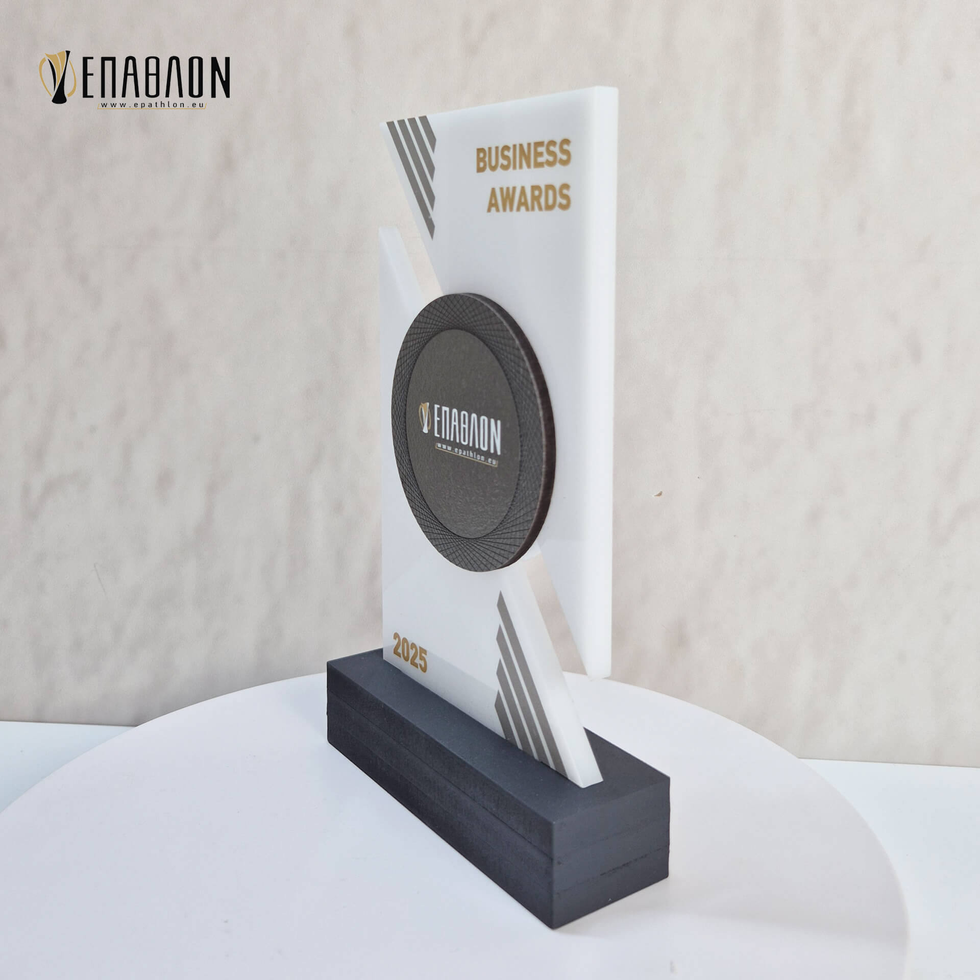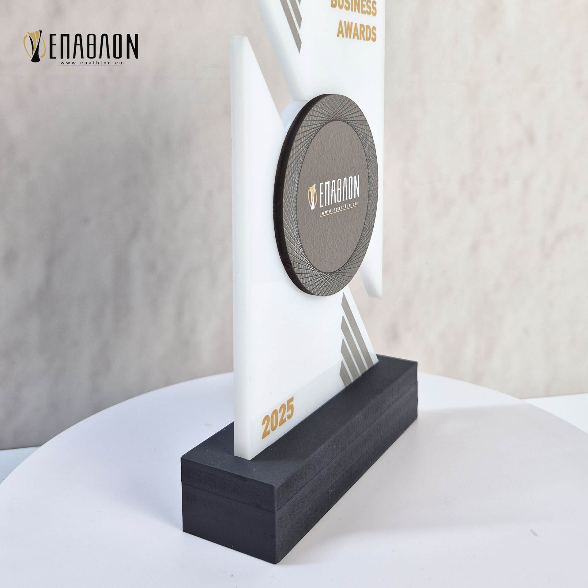 Επιχειρηματικό Βραβείο από plexiglass και ξύλο με έγχρωμη εκτύπωση επάνω στα υλικά
